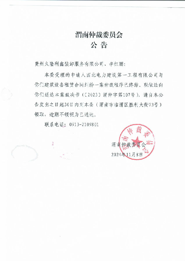 貴州久隆利鑫裝卸服務有限公司、李紅麗與西北電力建設第一工程有限公建筑設備租賃合同糾紛案公告